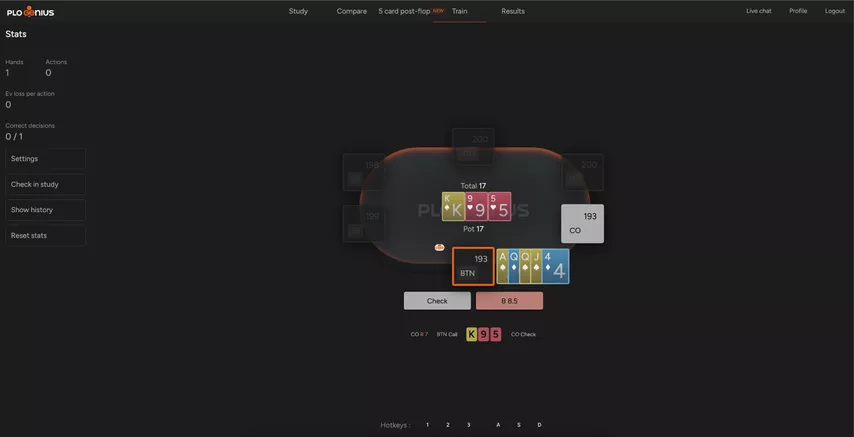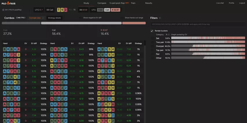 Платформа для изучения стратегии пот-лимитной омахи, построенная известным регуляром JNandez87 на базе тренажера PLO Trainer. Он использует предварительно посчитанные решения для 8-макс, 6-макс, хедзапа и МТТ, как на префлопе, так и на постфлопе.