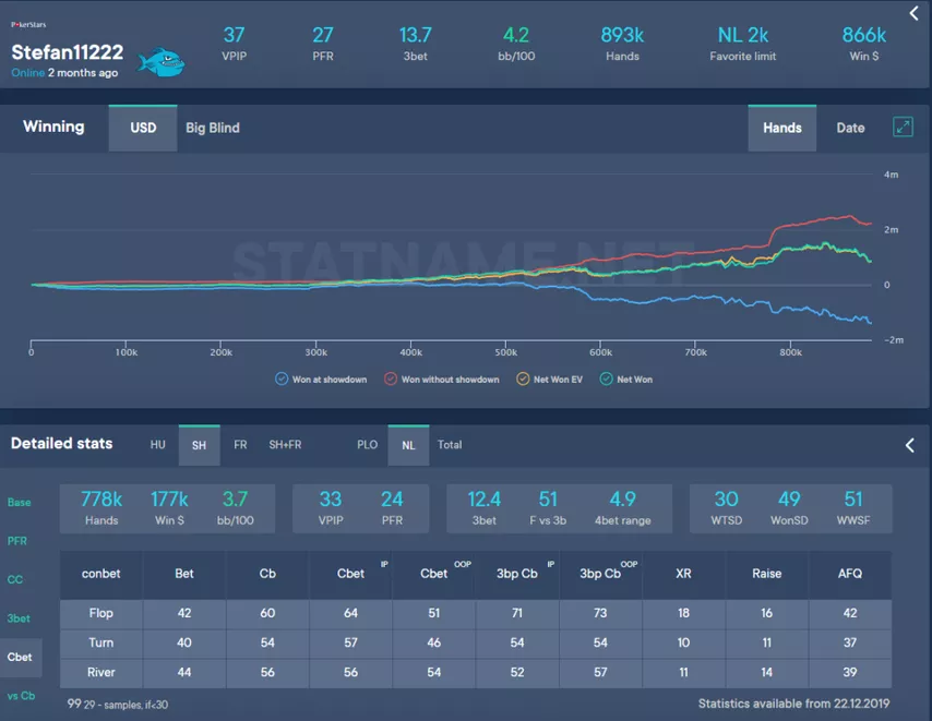 Онлайн-сервис, собирающий статистику кэш-игр с популярных покерных сайтов и сетей: GGPoker, Winamax, PokerStars, 888poker, iPoker, Chico и PokerBros. В отчетах можно посмотреть активность, статистические показатели и винрейты игрока на разных лимитах, начиная с NL5.