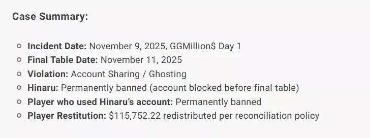 Еще до старта финального стола служба безопасности обнаружила, что с аккаунта Hinaru первый день играл другой игрок. Владельцы обоих аккаунтов получили вечный бан в сети GG, имена сообщников не разглашается.