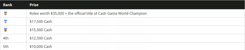 Призовой фонд чемпионата — $100K. Победитель получит часы Rolex за $35,000.