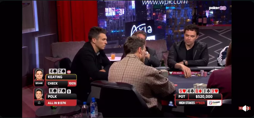 Еще один неудачный блеф зрители увидели в шоу High Stakes Poker. Алан Китинг заколлировал 4-бет Дага Полка с 42s и сыграл все улицы чек-колл.