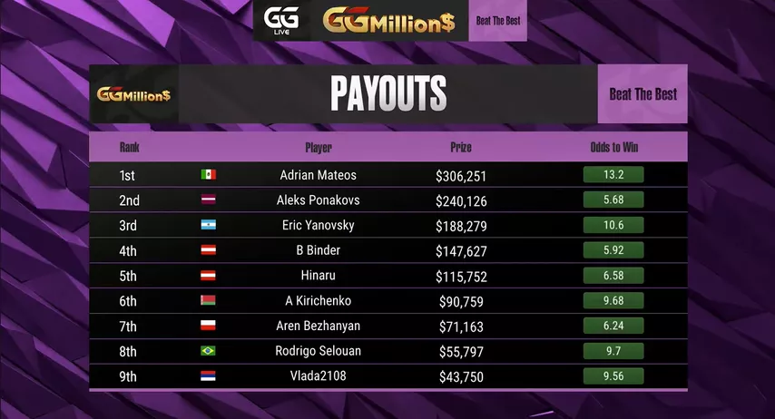 Победителем турнира стал Адриан Матеос, начинавший финальный стол с самым коротким стеком.