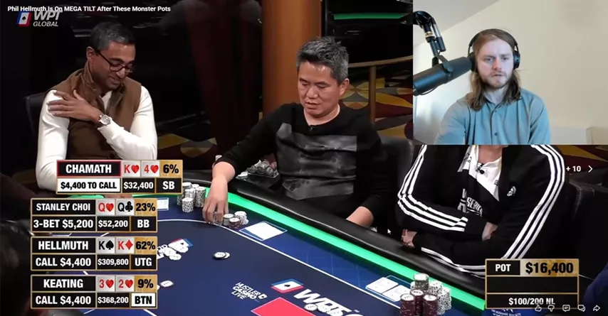 Начнём с раздачи, сыгранной в Hustler Casino Live, современной версии хайстейкс-шоу, и посмотрим, как он будет играть с людьми вроде Китинга.