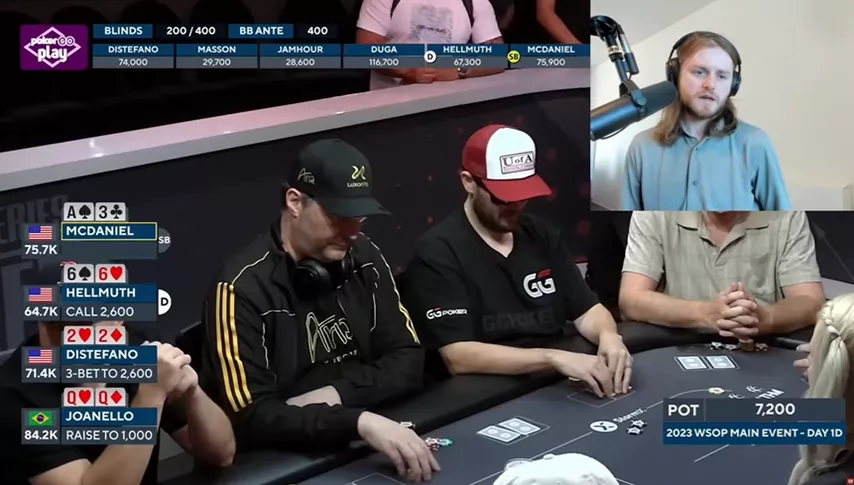 Рэйз, маленький 3-бет, и Фил со стеком примерно 160 бб играет колдколл на баттоне с парой шестёрок. И это, кстати, вполне нормальная игра. В главном турнире WSOP вы не увидите теоретических 4-бетов. Я могу записать двухчасовой монолог о том, как играть мэйн WSOP. Стилю Фила этот турнир очень подходит.