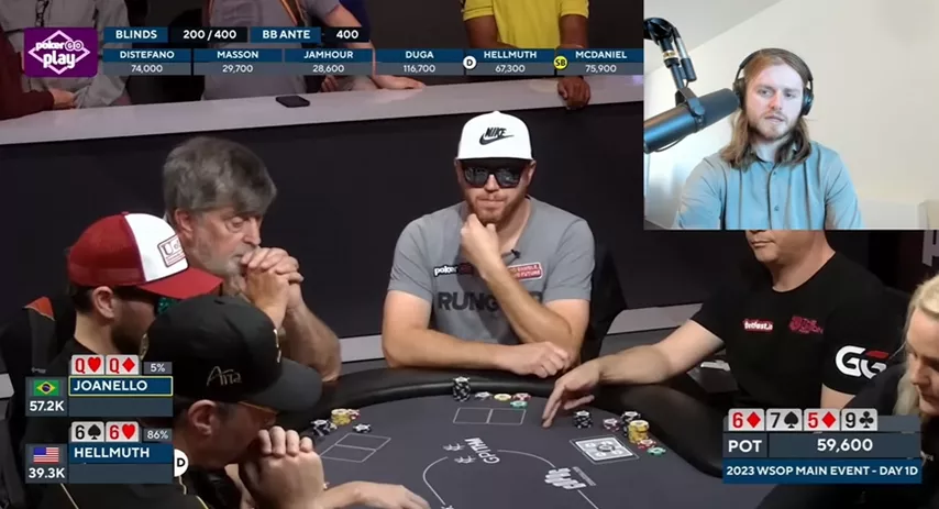 Жоанелло всё-таки ставит 4-бет с дамами, но выбирает очень маленький сайзинг – 8,000. Игрок с двойками фолдит, Хельмут делает колл. Думаю, это окей.