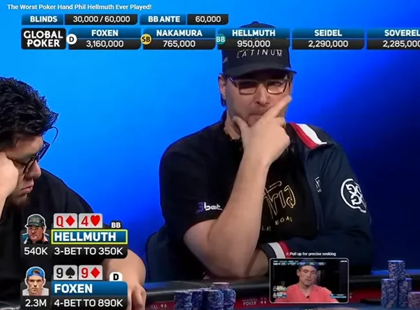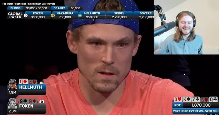 В этой раздаче Фоксен идёт олл-ин, и Фил решает заколлировать, полагая, что ему уже по шансам. Ужасно, как ни посмотри – GTO, эксплойт, неважно. Очень плохая раздача. Но не настолько плохая, как может показаться. По-моему, он среагировал на какой-то ридс, а когда получил олл-ин, осознал, что выкинуть уже не может.