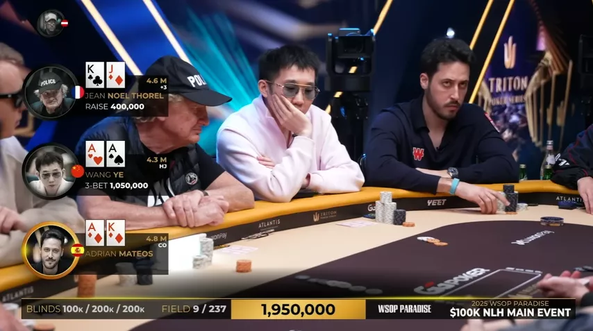 С он поставил 4-бет-олл-ин на 24 блайнда против сопоставимого стека Ван Е. Торель выкинул, а китаец сделал колл и отправил Матеоса в кассу за $495,000. При этом в игре оставалось три человека со стеками 12 блайндов и ниже. Вылет Матеоса дал всем им 102-тысячный пейджамп, но терпеливые шортстеки пересидели ещё одного оппонента – дополнительные $216,000! Абсолютно бесстрашный хироколл Жана-Ноэля привёл его к катастрофе.
