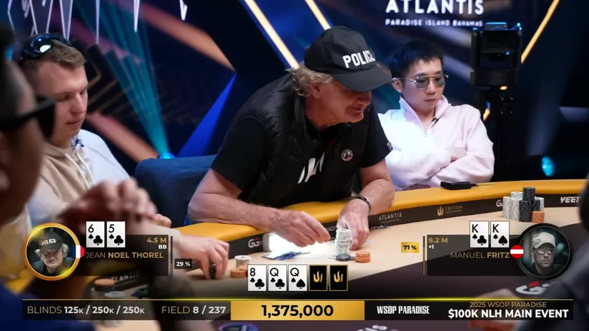 После чека Тореля его оппонент поставил олл-ин, заставляя принимать решение на последние 12 блайндов. Француз сделал колл, надеясь, что соперник блефует, но Фриц предъявил . 8-е место принесло Торелю $597,000, но это даже не самая крупная сумма, которую он получит на этом фестивале. На момент публикации статьи он большой чиплидер на финальном столе супермэйна за $25k.