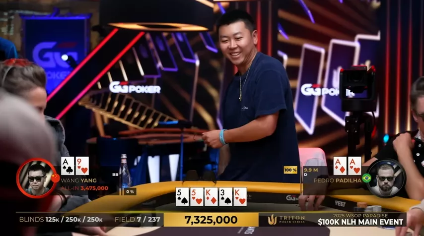 Китаец Ван Ян пал на 7-м месте, а полученный приз в $813,000 стал крупнейшим в его холдемной карьере. Именно холдемной, потому что год назад он в той же локации добался до 2-го места в 50-тысячнике по пот-лимитной омахе. Вылетел он в стандартном кулере – бигстек Падилья открылся с баттона, и Ван с ББ запушил 15 блайндов с А9о. Увы, у бразильца оказались тузы.
