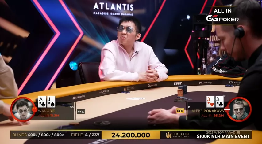 Ещё через две раздачи Поняков снова выставился против Ван Е. Алексей сделал опенпуш с баттона с двумя тройками. Китайский игрок заколлировал с – и на флоп пришла тройка. Пришлось довольствоваться 4-м местом и $1,865,000.