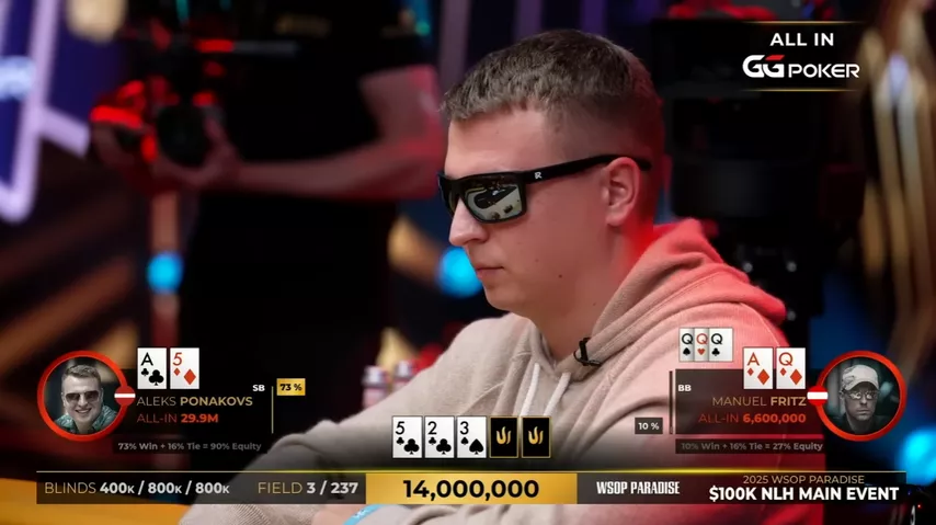 Самым коротким на этой стадии остался Фриц. С А5о на малом блайнде Поняков поставил против него олл-ин. С 9 бб можно сделать колл с рукой послабее, но Фрицу раздали – и пришлось вылавливать пятёрку на флопе!