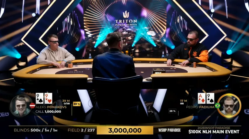 В хэдз-апе у Понякова было 47 блайндов против 28 блайндов Падильи. Не слишком глубоко, но простор для творчества есть. Однако матч за браслет продлился очень недолго. Вскоре Понякову раздали две девятки, с которыми он сделал лимп против стека в 19 бб.