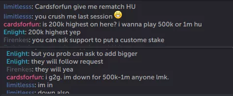 cardsforfun: 200k это самый большой лимит? Я бы хотел поиграть хедз-апы за $500k или $1 млн