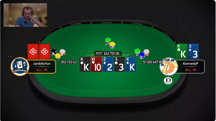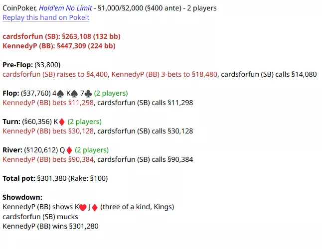 Для KennedyP встреча с новым соперником сложилась исключительно удачно – в какой-то момент у него в стеке стало больше $1 млн.