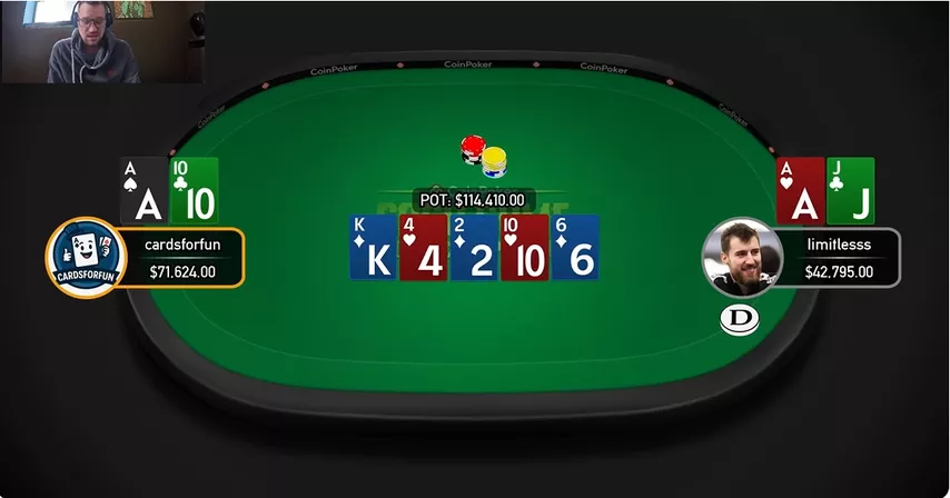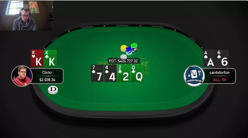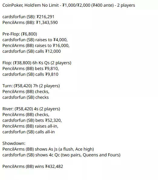 В середине декабря за дорогими столами CoinPoker появился неизвестный любитель с ником cardsforfun. Его первыми соперниками за столами $1,000/$2,000 стали регуляры PencilArms (по слухам, Prudently на PokerStars) и KennedyP (KennedyPK97 на PokerStars).