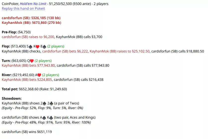 CoinPoker действительно быстро добавили столы $1,250/$2,500 и $2,500/$5,000 в глубине 200bb. Первым соперником сardsforfun на новом уровне стал Кайхан Мокри.