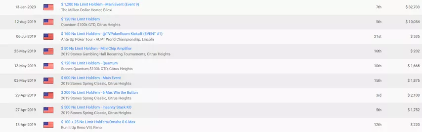 Интересно, что же с ним произошло в 2019-м? Единственный кэш после этого датирован 2023-м годом – финальный стол в Билокси. Не уверен, насколько достоверна информация, что он регулярно играет турниры, но я слышал, что время от времени он в них появляется.