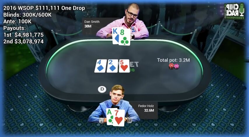 ДЛ: Раздача, которую мы собираемся обсуждать, была сыграна на Мировой серии 2016 года в турнире One Drop за $111,111 против Федора Хольца. Ваши стеки были примерно равными и довольно глубокими – более 50 блайндов.
