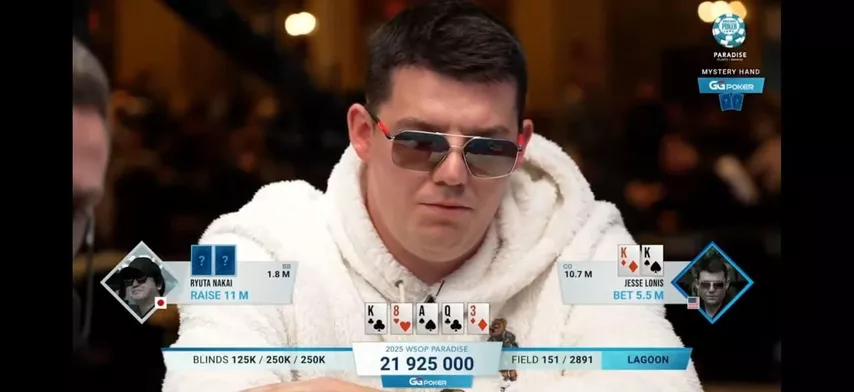 Джесси сделал рейз на префлопе и поставил три барреля, а на ривере сдался на рейз, соперник показал .