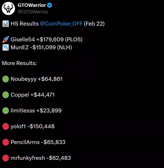 В твиттере GTO Warrior регулярно выкладывают результаты дорогой игры на CoinPoker.