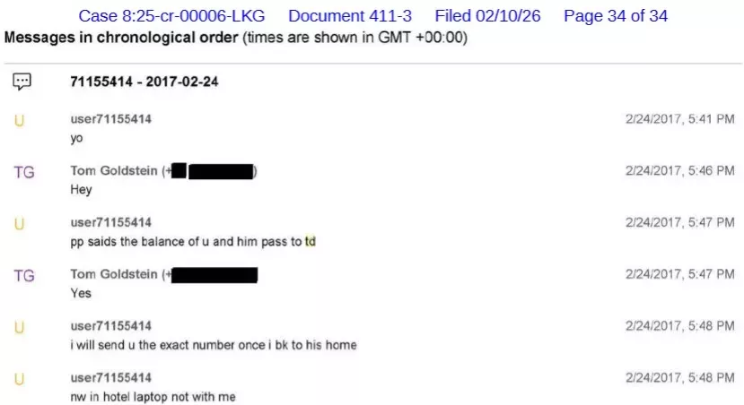 В переписке от февраля 2017 года, которую обнародовали в суде, некий представитель Фуа (user71155414) просит Голдстейна перевести долг на счет td (Том Дван). В 2015 и 2016 годах Голдстейн сделал два перевода Двану на общую сумму $1.2 млн.