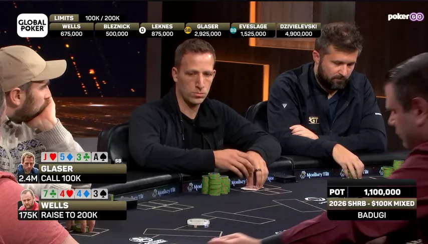 Ред. – На префлопе Глазер с готовой бадуги до валета поставил 3-бет, Роберт с сделал колл. Глазер «встал», Уэллс поменял одну и получил . Глазер поставил, соперник переставил. Поменяли по одной (Глазер разбил бадуги), Уэллс собрал , Бенни получил . На последнем обмене Уэллс поставил остатки стека, Глазер сделал колл и поменял одну, но не усилился.