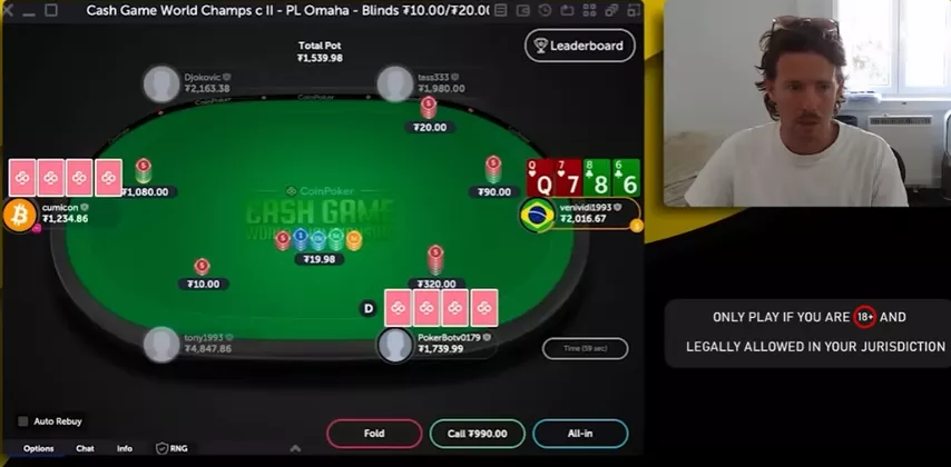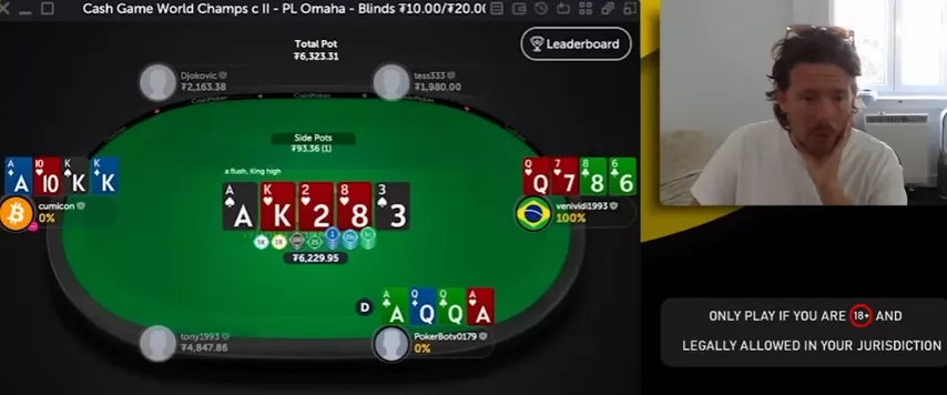 Первый оппонент чекает, катофф ставит банк, баттон фолдит. VeniVidi выставляется против катоффа. Тот показывает и выигрывает раздачу, когда на тёрне и ривере кладут две чёрные четвёрки.