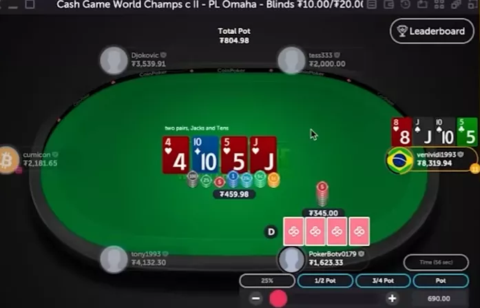 Здесь мы открылись, получили 3-бет и 4-бет. Наша рука довольно хорошо стоит против двух соперников с – получить такой расклад в 6-макс-омахе вполне реально. Если же нет, против нас будет много высоких карт.