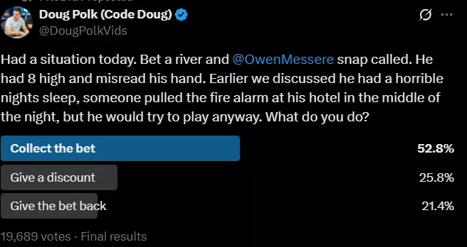 – То, что из 8,000 проголосовавших 62% не вернули бы деньги – это просто позор для покера, – возмутился Майк Матусов. – Куда смотрели родители этих людей? Тут же даже никакого трюка не могло быть, просто колл с 6-хай на ривере. Ставку ривера точно надо вернуть, тут даже обсуждать нечего!