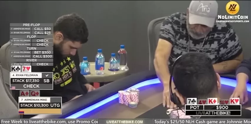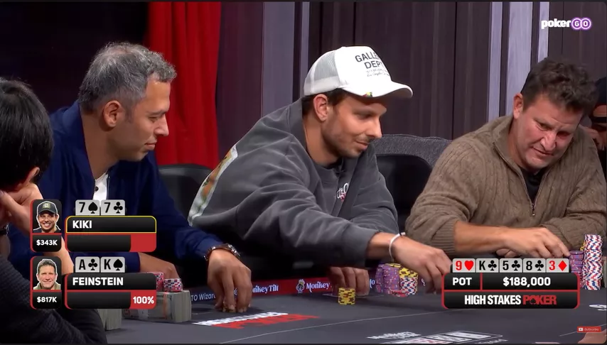 Для меня самое вопиющее, если смотреть на замедленной скорости, отлично видно, что Файнстайн взялся за фишки, показывая, что он готов сделать колл. Кики это заметил, сразу убрал руку и тоже попытался перевести все в шутку.