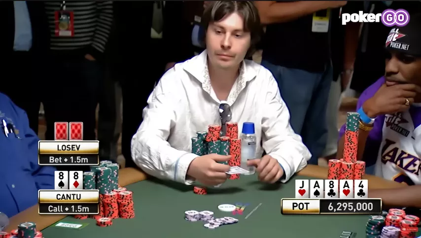 Самую знаменитую подобную раздачу сыграл Николай Лосев в 6-м дне главного турнира WSOP 2008.