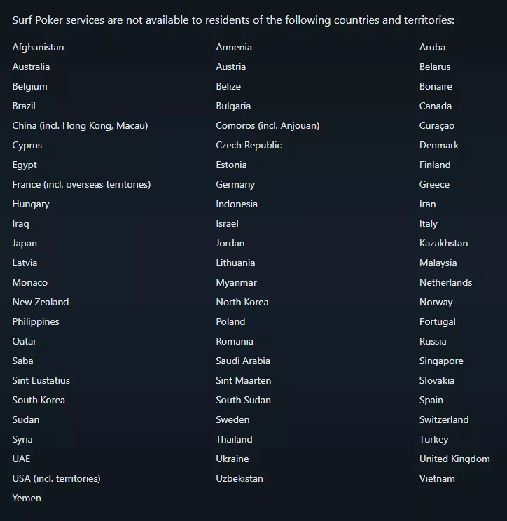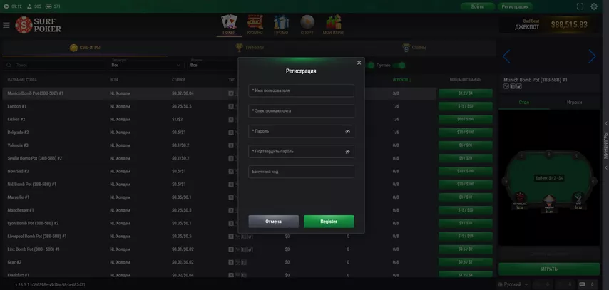 Surf Poker работает только из браузера, поэтому для регистрации понадобится перейти на сайт. Правда, далеко не из всех стран это получится сделать без проблем: