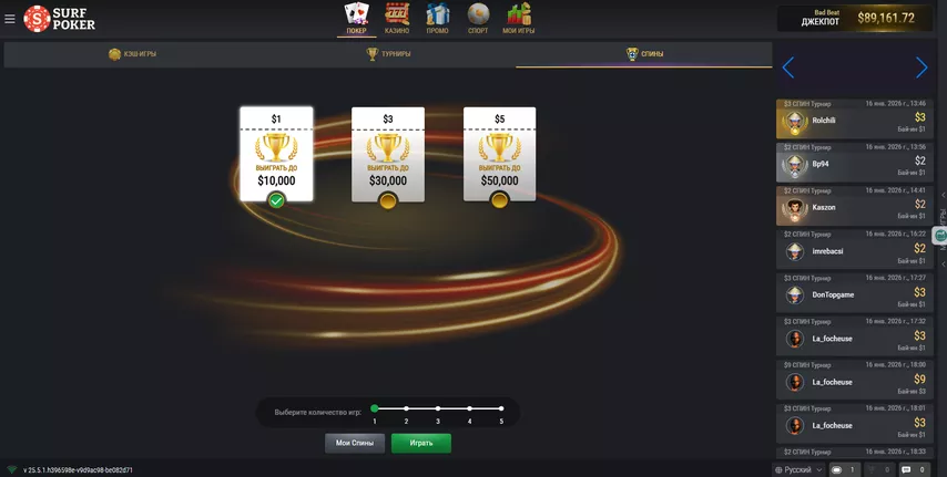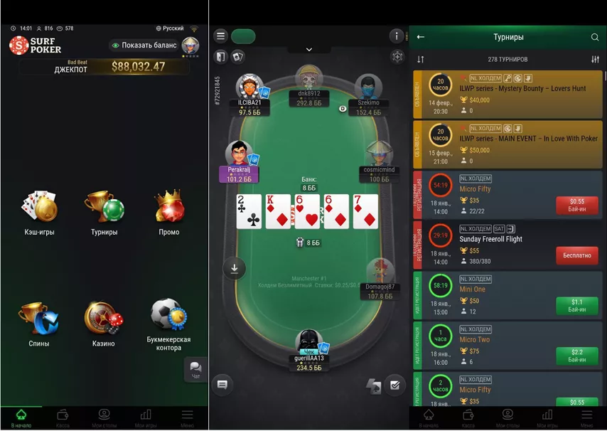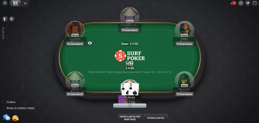 Структуры на Surf Poker турбированные: в турнирах, которые начинаются в 19 часов, блайнды растут каждые 6 минут, а в тех, что стартуют в 20 часов — каждые 8 минут.