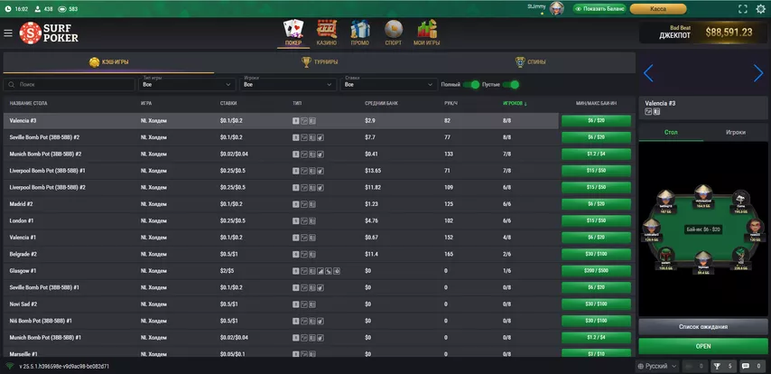 Главный козырь Surf Poker — это любители, зашедшие из казино. Тут, к счастью, ещё не ограничивают селект: лобби открыто, есть вейт-листы, так что для поиска слабых игроков можно по старинке открыть все столы, оценить стеки и игру, и встать в очередь за нужный стол.