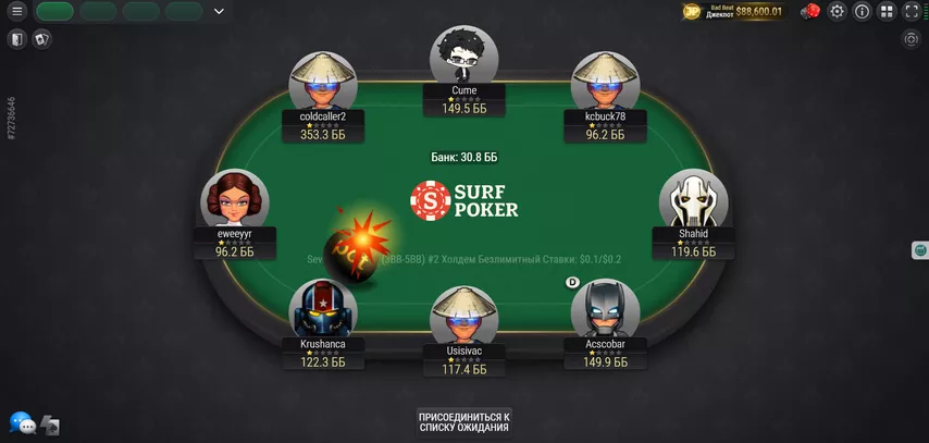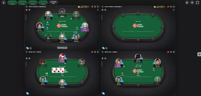 Отношение к регулярам — нормально. Любой софт на Surf Poker запрещен, а одновременно играть получится максимум 4 стола. При этом лобби в кэше открытое — получится выбрать подходящий стол, увидеть ники игроков и встать в очередь, которая редко будет больше одного человека.