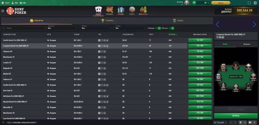 Софт — нормально. Хотя игра ведется из браузера, за время тест-драйва не было замечено каких-то серьезных багов и лагов. Ожидать удобства еврорумов не стоит, но в сравнении с другими браузерными румами софт Surf Poker показывает себя достойно.