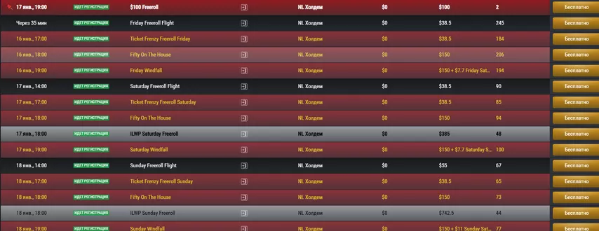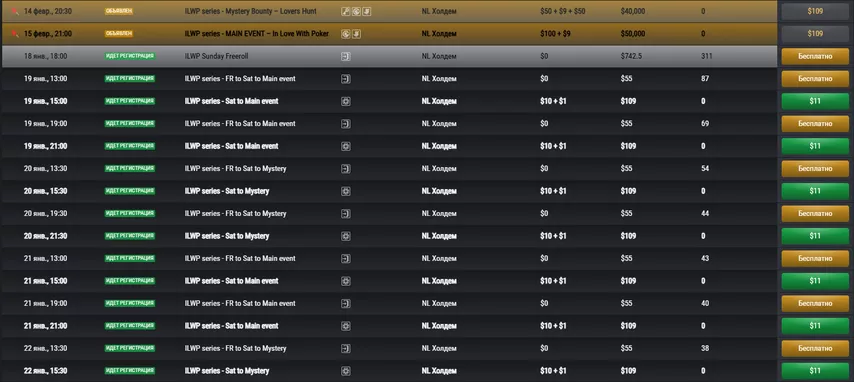 В сети проводятся и турнирные серии с более внушительными гарантиями. Например, 9 февраля стартует ILWP с мейном на 50,000 и мистери-баунти на 40,000. Пройти отбор можно через сателлиты и фрироллы, с билетами в качестве призов.