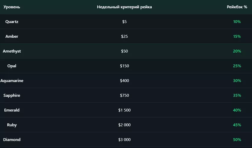 Программа лояльности состоит из 9 уровней, выплаты происходят еженедельно. Все игроки GipsyTeam со старта получают 30% рейкбека без условий по наигранному рейку. В теории же можно получать до 50% за 3,000 комиссии в неделю, но для этого в сети должна появиться более дорогая игра.