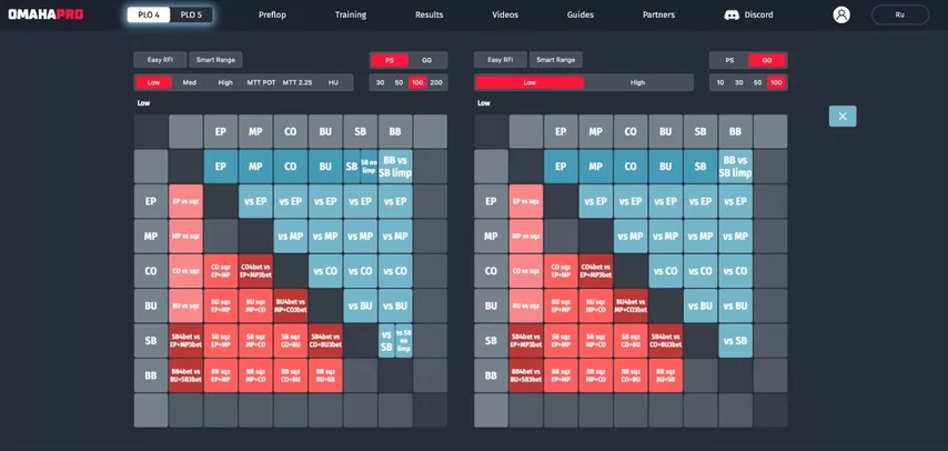 Сервис для изучения префлопа и постфлопа в PLO с опорой на GTO-симуляции под различные стеки и структуры рейка. Включает тренажер для отработки префлопа в PLO4 и PLO5, который можно использовать для предыгровых тренировок или тщательного анализа.