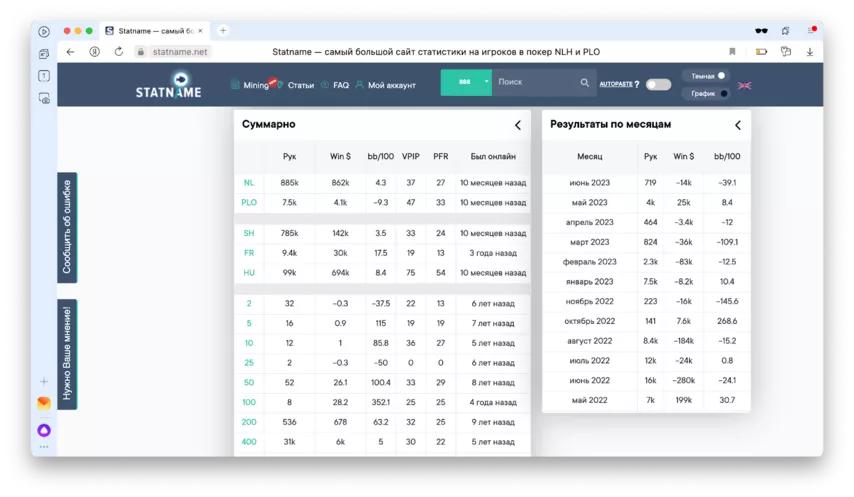 • Статистика для всех лимитов холдема и омахи, начиная с 0.05/0.10.