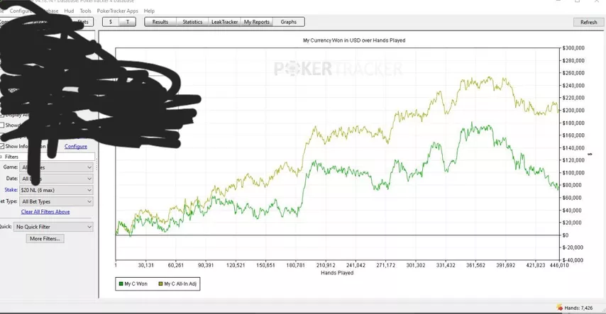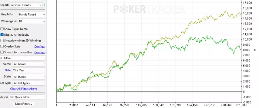 Зацените эту жесть на скриншоте: несчастный регуляр за 250,000 раздач недобрал 70 бай-инов. И вот какой у меня для вас вопрос: как считаете, после ещё миллиона раздач жёлтая и зеленая линии станут ближе друг к другу или разойдутся ещё сильнее? Должны ли они сойтись?