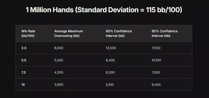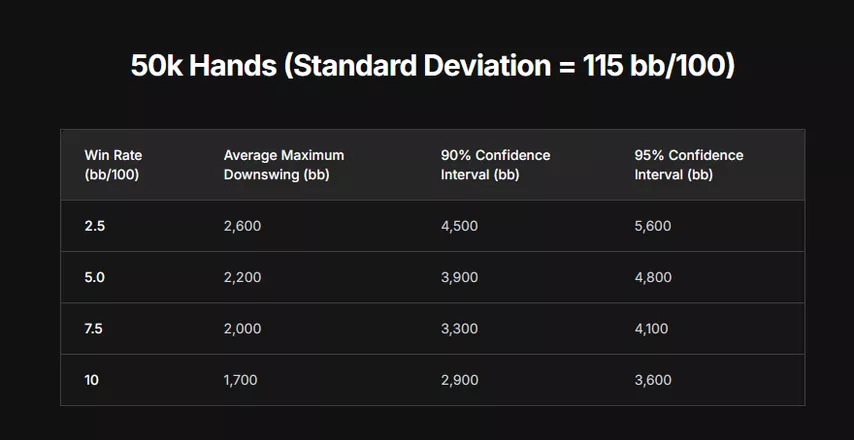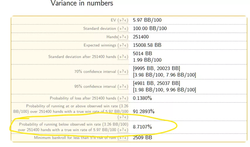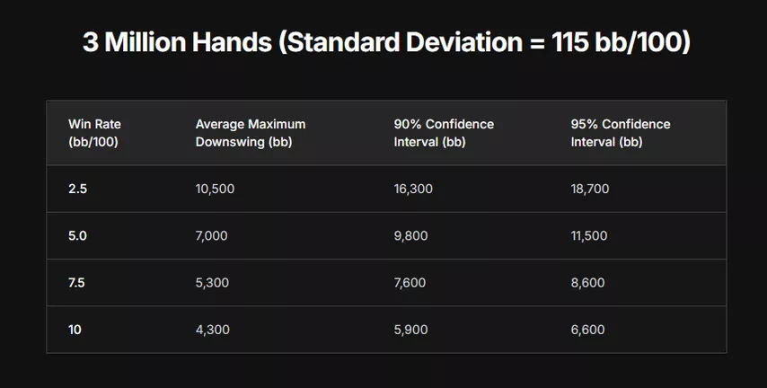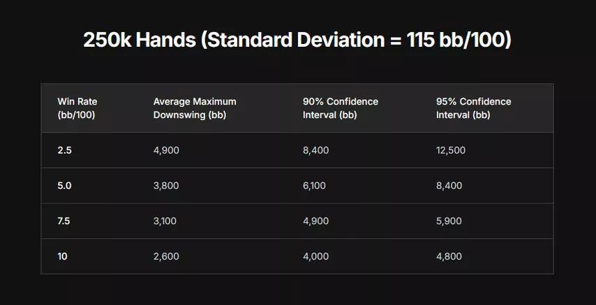 Скажем, вы — игрок с винрейтом 7.5 ББ на 100, который попал в даунстрик на 3,100 ББ. На дистанции в 250,000 рук, по нашим расчётам, это как раз средний максимальный даунстрик. То есть, грубо говоря, обычное дело. Если вы играете 20,000 раздач в месяц — будете ловить такой стрик примерно раз в год. Но всё может быть и хуже. Интервал уверенности в 95% — до 5,900 ББ. Это маловероятно, но тоже будет нормой.