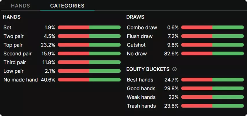 Программа показывает, какие категории рук вы разыгрываете максимально далеко от оптимальной стратегии. При желании можно сравнить как любую конкретную комбинацию из диапазона, так и один диапазон с другим.
