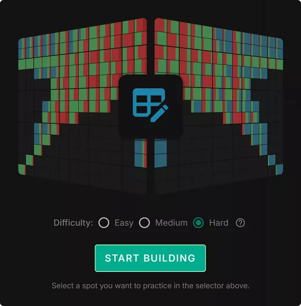 Разработанную стратегию затем можно использовать для проверки знаний префлоп-ренджей и правильных реакций на открытия оппонентов. Для этого нужно перейти в Range Builder из вкладки «Практика», выбрать уровень сложности, готовое решение (например, BU vs BB в стеках 30 блайндов) и конкретное действие, которое вы хотите потренировать, а затем нажать на кнопку «START BUILDING».