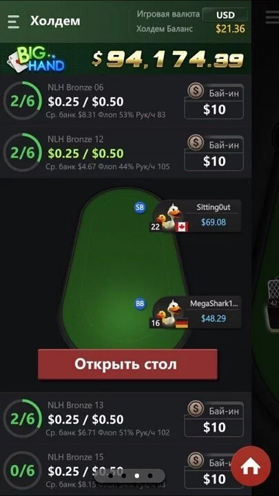 В мобильном клиенте разрешено играть до 4 столов одновременно. Навигация — удобная, ориентация — вертикальная, для использования смартфона одной рукой. Вся информация доступна на русском языке.