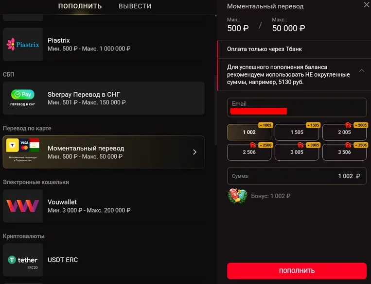 Минимальная сумма депозита равна 500 RU, максимальная — 300,000 RU. Некоторые платежные опции дают больше возможностей. Например, через Piastrix можно внести до 1,000,000 RU за транзакцию. У BinancePay максимальный порог достигает 5,000,000 RU.