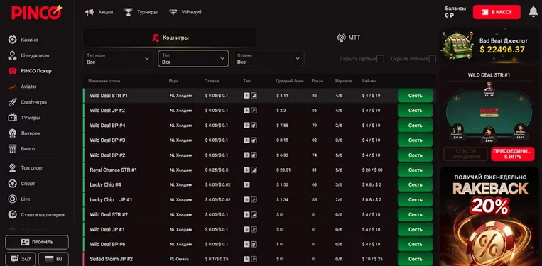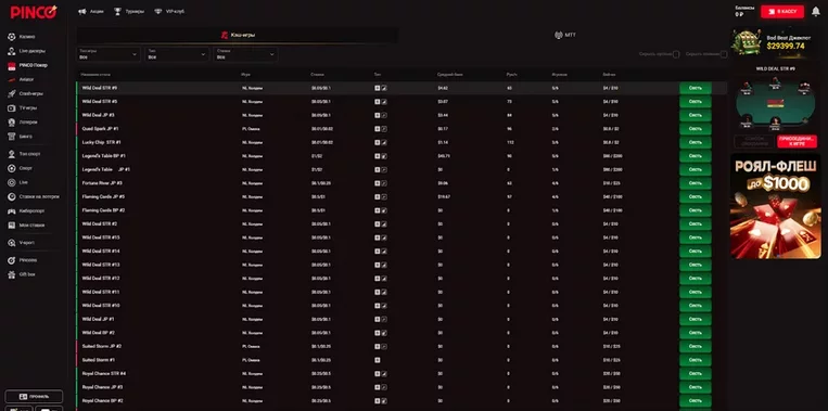 Рум не предлагает отдельные клиенты для компьютеров или смартфонов — только версию для браузера. Чтобы открыть лобби, нужно кликнуть на Pinco Poker в левой части экрана. Кнопка идет третьей в списке после “Казино” и “Live-дилеры”. Центральную роль в навигации отвели двум разделам: “Кэш-игре” и “MTT”. Рассмотрим каждый отдельно.