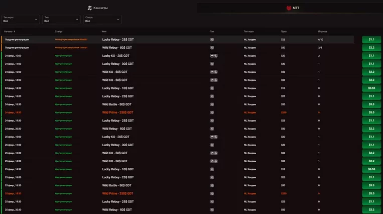 Турнирное расписание пока лаконичное и состоит из недорогих турниров от 0.55 до 11. Поля не самые массовые, зато можно ловить оверлеи: в ежедневном Wild Prime с гарантией 250 организаторы добавляют 100-150.