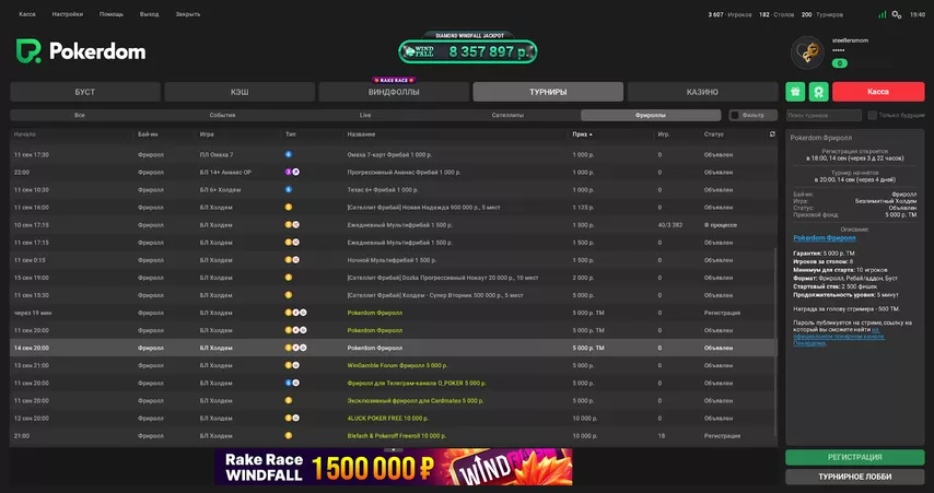 Pokerdom регулярно проводит много фрироллов. В открытые бесплатные турниры пускают всех желающих. В приватные не попасть без билета или пароля.