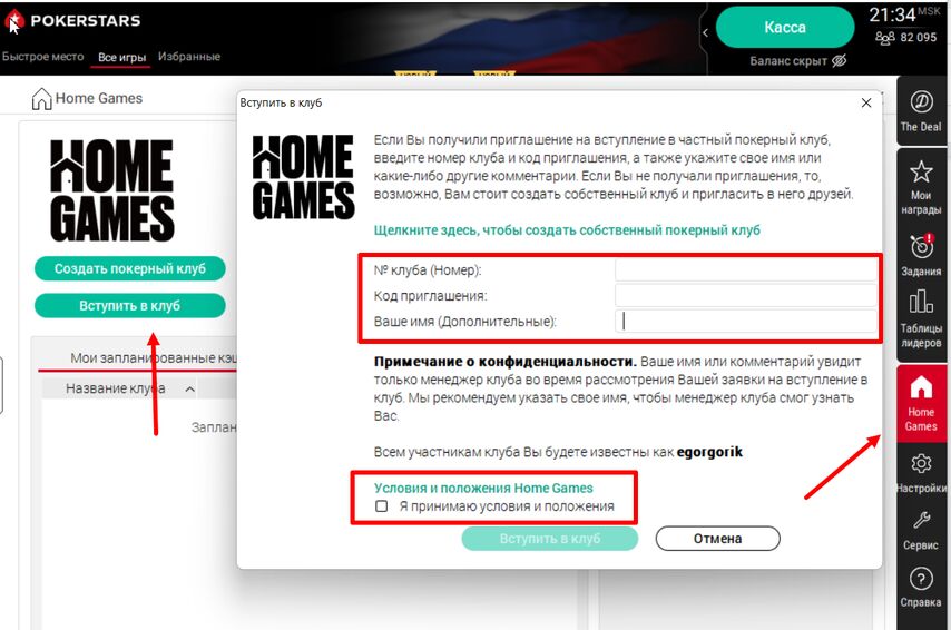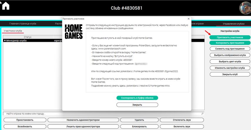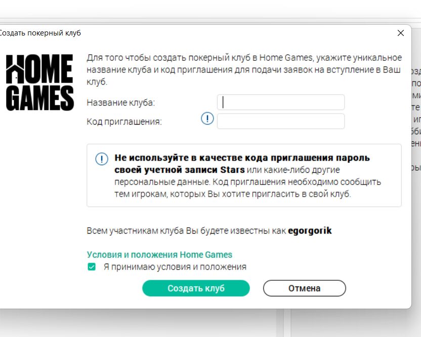 - Код приглашения. Кодовое слово для входа в домашние игры. Оно защищает сообщество от случайных посетителей. Не используйте в качестве кода пароль от учетной записи ПокерСтарс.